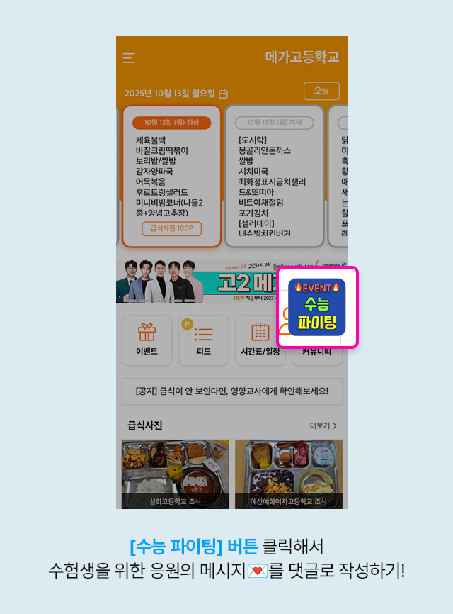 김급식 앱에서 수험생을 위한 [응원 문구]를 댓글로 작성하기!