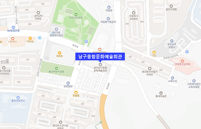 | 장소 | 남구종합문화예술회관 공연장 주소 : 광주광역시 남구 봉선로 208 (지번) 광주광역시 남구 봉선동 1068 |